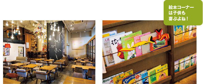 子供連れママにうれしいソファ席がメインのカフェ。ゆったりとくつろげる隠れ家的空間を演出する、植物やたくさんの本がスタンバイ。料理や自家製スイーツをはじめ、オリジナルカクテルも充実しています。