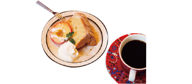 コーヒーにマッチする、蜂蜜とりんごのケーキ。シフォンケーキ(ドリンクセット)800円(税込) ※ケーキは季節によって変わります