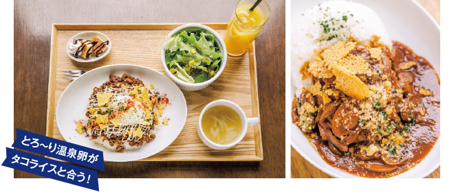 【左】辛くないから子供にもGOOD。サラダ、スープ、ドリンク、プチデザート付き。温玉のせ! メキシカンタコライスBセット1000円(税込)