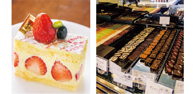 【右】菓子店奥のショーウィンドウには種類豊富なチョコレートがずらり。ひと粒ひと粒ていねいに作られたチョコレートは、見た目も味もGOOD!