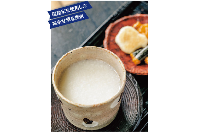 福島県「宝来屋」の甘酒を提供。砂糖、添加物不使用の麹本来の優しい甘さ。甘酒(おかき付き)750円(税込)